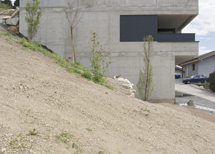 Les trois villas contiguës se situent en contrebas du village de Blignou, en limite de la zone résidentielle. Elles sont intégrées dans un terrain en pente, avec une profondeur de construction définie par le PAD de la zone. Les villas sont le résultat de la densification demandée par la LAT, qui augmente les indices constructibles. Situées dans le terrain à forte déclivité, elles suivent aussi la morphologie de la route permettant un décalage adapté aux accès de voitures en bas et se répercute avantageusement à l'étage pour les chambres. Au dernier étage, les terrasses nord profitent du décalage qui cherche le soleil couchant pour chacune. Les façades s'identifient par du béton apparent et contrastent avec les légers décrochements peints en noir. À l'opposé du caractère stérile et minéral des façades, on trouve à l'intérieur un aspect accueillant et chaleureux, grâce à un séjour organisé autour de la loggia et différentes touches de revêtement en bois.