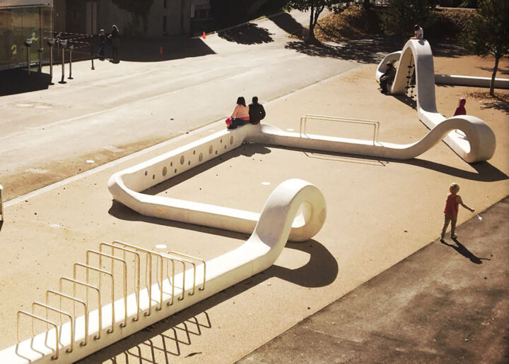 "La Boudineuse " offre un espace de jeu et d’évolution partagé par l’école des Boudines et par l'espace d'accueil de l'enfance EVE-Cité. Tantôt assise, tantôt jeu, il est formé d’une seule entité linéaire et de diverses variations tout au long de son parcours de plus de 70m. Les différentes déformations et mouvements de sa section génèrent des jeux moteurs: surfaces de glisses, balanciers ou éléments à grimper, complétés d’équipements de jeux cognitifs (porte-voie, passoire à vue). Sa forme articulée offre aussi plusieurs sous-espaces d’appropriations propices au jeu social. "Glissoire", "Passoire à vue", "machine à en découdre", "Cabriole", sont ainsi autant de composantes ludiques du jeu. Réalisé en pièces préfabriquées en béton moulé, teinté et poli, il est complété d'éléments en acier inox cintrés.