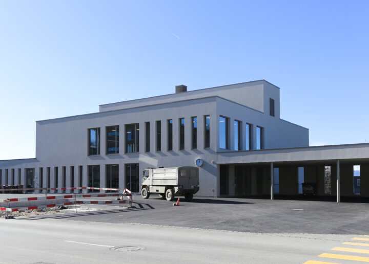 Compris dans la deuxième étape d’assainissement général de la place d’armes de Bure, le projet du centre de subsistance conçoit de maintenir les volumes des anciens réfectoires et de remplacer la maison du soldat par un nouveau bâtiment. S’organisant le long de l’axe ordonnateur en forme de courbe face aux quatre casernes de troupes, l’ensemble forme une figure parfaitement symétrique et conserve la dimension urbaine et historique du lieu. Le nouveau poste de rétablissement se situe dans le quartier de la gare de la place d’armes de Bure. La proximité aux quais de chargement et la place de manoeuvre disponible aux alentours en font un terrain propice à son exploitation. Dans un geste linéaire, le nouveau volume s’inscrit en prolongement du bâtiment d’entrepôt principal du secteur de la gare. La grande toiture, uniforme et rectiligne, se retourne à son extrémité Sud en formant une nouvelle façade pignon faisant front à l’accès au site, à l’image d’un bouclier de protection.