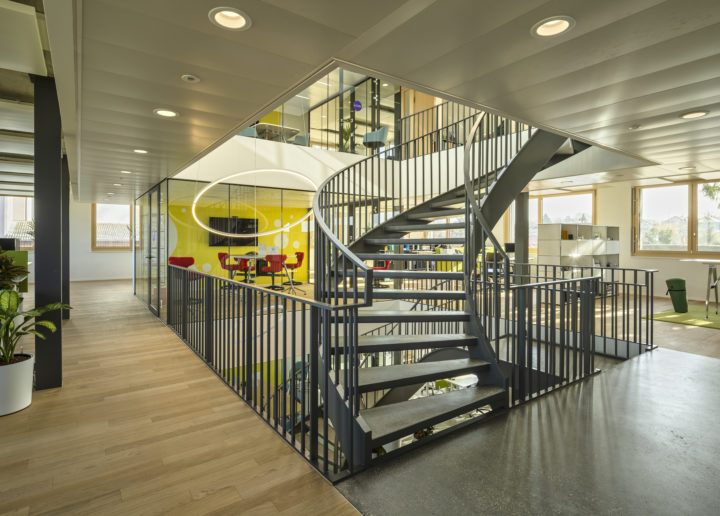 Le projet répond à la demande du bureau Weinmann Energies SA, implanté depuis sa création à Echallens, de regrouper ses activités sur un seul site. Le volume compact et régulier à l’extérieur, se distingue à l’intérieur par des espaces lumineux où la transparence favorise les contacts. Le projet se développe autour d’un grand atrium central qui assure, par un escalier en colimaçon, la distribution des trois niveaux ainsi que l’accès au toit-terrasse. Les bureaux, aménagés en open-spaces, sont répartis dans les étages et s’ouvrent sur l’extérieur, alors que les salles de conférence, vitrées, sont tournées vers le noyau central ouvert et baigné de lumière. Ce cadre de travail, qui facilite les échanges, est complété par des zones assurant une plus grande privacité. Alors que les huitante collaborateurs étaient auparavant répartis dans plusieurs bureaux séparés, ils sont désormais réunis sur un même campus, dans un lieu propice aux rencontres, qui renforce l’image de l'entreprise.