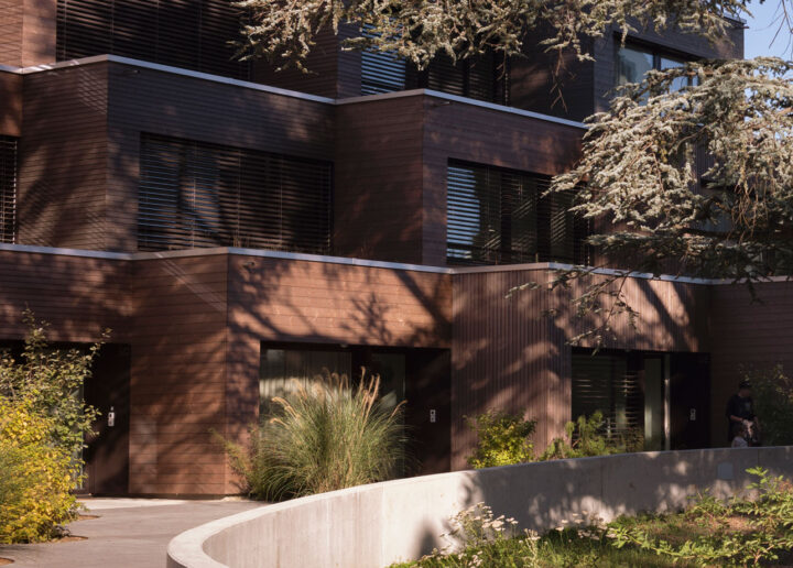 Grâce à sa typologie de résidences mitoyennes, entre villa et logement collectif, Cedar Housing offre un premier glissement vers une densité urbaine supérieure. Comme son nom le révèle, Cedar Housing est centré autour d’un cèdre centenaire. L’arbre raconte l’histoire du lieu et en définit le caractère. Avec son architecture à gradins, l’ensemble englobe l'arbre et en définit la cour, lieu de partage pour les activités en collectivité. Si cette face du bâti privilégie le vivre ensemble, c’est à l’inverse la privacité qui est à l’honneur côté jardin. Ces différentes qualités d’espaces sont générées au travers de creux et de redents, les volumes se détachant les uns des autres tels des cabanes dans les arbres. Les matériaux sélectionnés entrent en écho avec l’espace végétal. En dissociant le bardage de chaque volume, les architectes altèrent la perception d’échelle. Cet effet visuel minimise la perception du gabarit du logement afin de l’harmoniser à son contexte résidentiel.