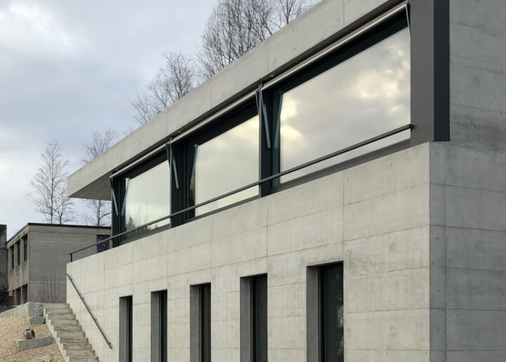 En adéquation avec la nécessité de densification des zones villas, le projet de nouvelle villa répond au souhait du maître d’ouvrage de pouvoir bénéficier d’une construction plus compacte correspondant à ses besoins futurs. Sur une grande parcelle occupée par la maison familiale existante, le nouveau volume vient s’insérer en douceur dans la pente du terrain tout en préservant les dégagements vers l’ouest pour les deux constructions. Au rez-de-chaussée, se trouvent les chambres en contact direct avec l’espace extérieur. Les fenêtres verticales découpent le paysage et renforcent l’idée du socle. A l’étage au niveau de la rue, le séjour s’ouvre sur le paysage par trois grandes baies vitrées panoramiques. Le contraste entre les murs en béton apparent et les ouvertures souligne l’horizontalité de la façade tandis que le bardage en épicéa prégrisaillé des garages apporte une touche de fraîcheur à l’ensemble.