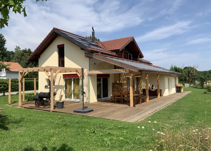 Adossée à cette maison des années 2000, une extension en bois a été créée en continuité de la chambre existante. On a conservé l'identité des lieux par une toiture en pente sur laquelle viennent se poser des panneaux solaires. Une pergola en pente est construite en continuité à l'extension nouvelle et des panneaux semi transparents sont posés faisant ainsi ombrage sur la terrasse. Dans l'extension, une séparation entre deux espaces a été créée par des briques de terre crue, on a également réutilisé la porte-fenêtre déposée. La structure de l'extension est en bois suisse, l'isolation en fibre de bois, le crépis est minéral tant à l'intérieur qu'à l'extérieur, l'isolation sous chape est en liège et celle sous radier en verre cellulaire. La terrasse a été agrandie et refaite à neuf, on a posé le nouveau revêtement sur des vis de fondation. Enfin, on a créé une petite pergola devant la cuisine et un couvert à voiture sur le côté opposé.