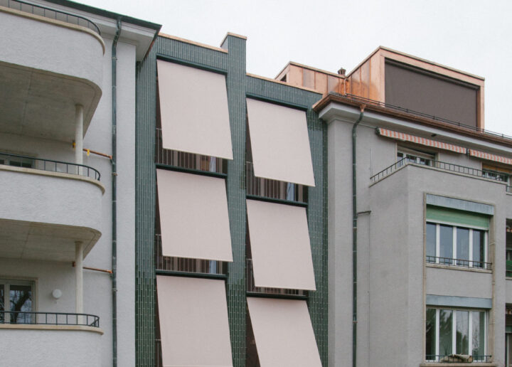 Dans un quartier de logements des années 30, installé au pied du parc de Valency, le règlement offrait exceptionnellement le droit de construire entre deux immeubles. Le projet tire parti de cette opportunité pour densifier les parcelles et offrir une plus grande flexibilité aux habitants. Le projet est l’occasion d’une rénovation lourde et de multiples transformations notamment en toiture. Depuis l’extérieur, il prend la forme d’un petit bâtiment autonome inséré entre les deux immeubles d’origine. De l’intérieur, il propose de part et d’autre des réponses typologiques variées en étendant les logements existants ou en en créant de nouveaux. La matérialité de la façade cherche à préserver la lecture des volumes initiaux tout en offrant une identité claire à l’extension. Construite en bois et revêtue de terre cuite émaillée, la nouvelle façade s’insère dans le quartier en jouant avec les volumes et les reflets du contexte immédiat.