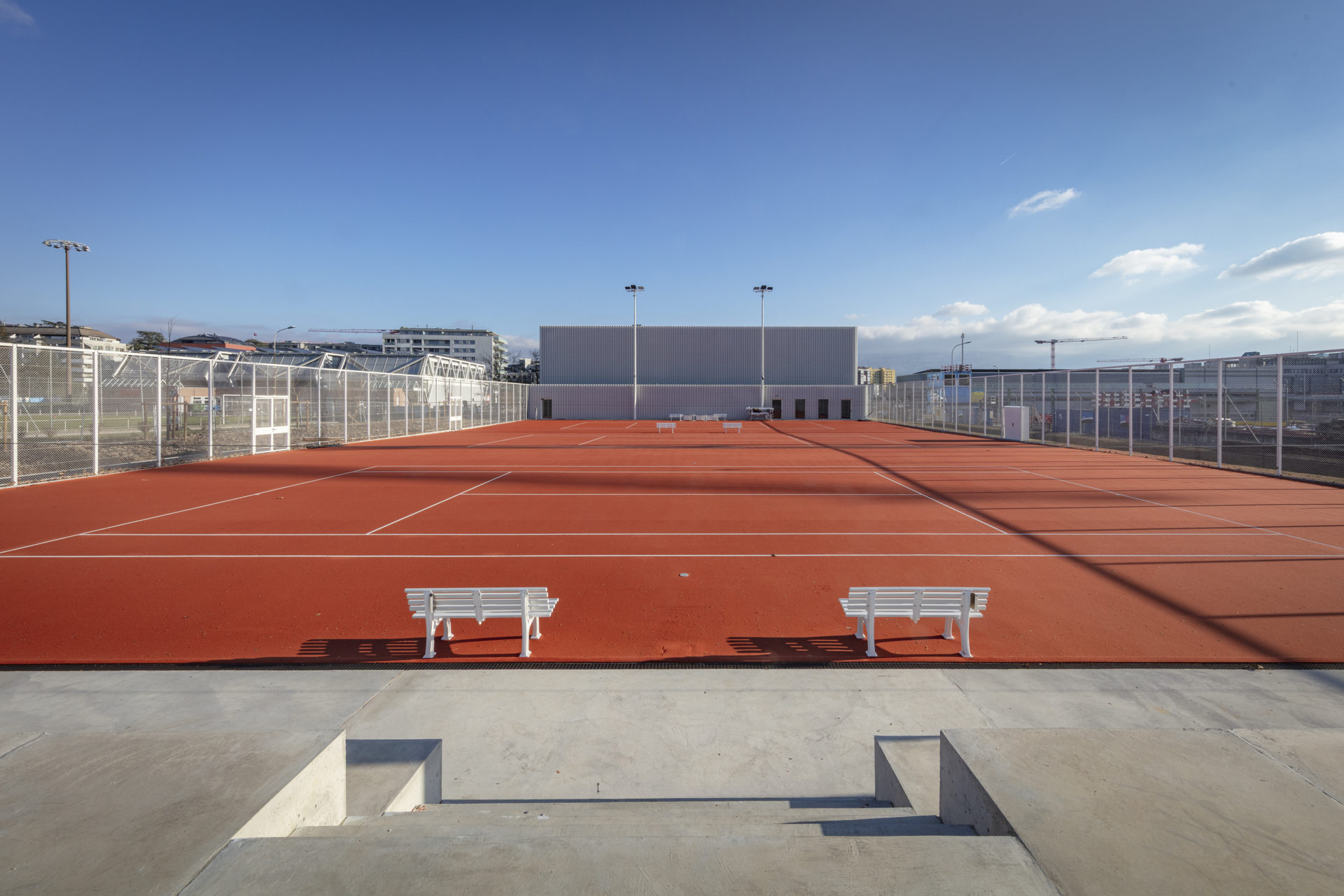 Le secteur du Bois-des-Frères se situe dans un quartier en pleine mutation. Afin de répondre à l’évolution des besoins de la population, le centre sportif complète ses équipements par la création d’une halle couverte permanente pour trois terrains de tennis et la création de trois autres terrains extérieurs. Sur la toiture de la halle, une centrale photovoltaïque de 2’135 m², constituée de 460 panneaux d’une puissance totale de 193 kWc, est installée. Un soin particulier est apporté à la végétalisation de la toiture grâce à une composition sur mesure de compost réalisée par l’HEPIA. Une nouvelle placette ombragée accompagne la halle et permet l'attente et la distribution aux différents bâtiments sportifs préexistants voisins.