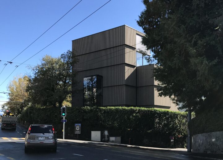 Cette immeuble de 6 niveaux remplace une villa des années 30. Il s'inscrit dans une parcelle exiguë, se calant sur chaque limite, en cherchant les différentes percées, et délimitant l'angle des 2 rues (Rte. de Vevey/Rue du Port). Toute l'arborisation a été conservée afin d'intégrer ce nouveau volume conséquent. Il est composé de 2 appartements en duplex avec jardin surmontés de 3 triplex. Les 2 étages d'attique participent à l'élancement de l'édifice, sa volumétrie ayant été étudiée pour en diminuer l'impact. La modénature des façades en bois grisé (bardage de fines lames verticales/tôle horizontale coupe-feu) dialogue avec la verdure, toujours dans le but d'intégration. Le bâtiment est orienté nord-sud, avec tous les escaliers et salles de bains au nord et les pièces à vivre au sud, prolongées de loggias, intégrant des jardins d'hiver. L'accès au parking se fait de plein-pied par la Rue du Port, en contre-bas. La cage d'escalier de l'immeuble s'apparente à une grande lanterne.