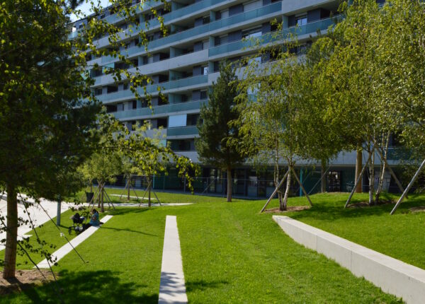 Malgré les 146 m de long du bâtiment LMI du Parc, à l’emplacement de l’ancien stade des Charmilles, le bureau br architectes associés a mis en œuvre une esthétique de la transparence : verticalité des 6 cages d’escaliers vitrées et traversantes, parc dans la continuité du rez, et jeu aléatoire entre verre et béton des balcons, atténuant l’horizontalité. La SCHG est propriétaire de 4 allées sur 6 (74 à 80), pour 96 logements HM, les allées 70 et 72 en comptent 44 en PPE, soit 140 logements du 2 au 6 pces sur 8 étages. Le rez comporte les halls d’entrée, une buanderie atypique, une salle commune, le parking sur 2 niveaux de sous-sols. Le bâtiment intègre un nouveau concept de logements à mixité intégrée (LMI) : une pièce additionnelle est utilisée pour une activité sans nuisance, ou comme habitation indépendante pour un parent âgé, un adolescent. La SCHG a doté 24 logements de pièces LMI, remportant ainsi l’adhésion des locataires dont une majorité d’entre eux y exerce une activité.