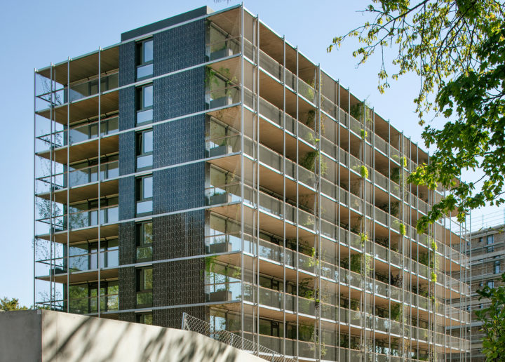Le projet immeuble galerie-jardin a été développé avec la préoccupation d’offrir un mode de vie en relation avec la qualité paysagère particulière du site, à la fois «dans la ville» et «sur la ville». Inscrite dans le parallélépipède issu du PLQ avec une orientation franche Nord-Sud, la proposition typologique est fortement empreinte de sa position apparemment neutre. Le plan est balancé très fortement entre le Sud-Ouest et le Nord-Est, avec d’un côté les séjours «déroulés» en longueur accompagnés d’une large terrasse couverte, et de l’autre avec les chambres en série. La profondeur de 18m définie par le PLQ est exploitée, la galerie-jardin agit comme un avant-toit au Sud, optimisant les gains solaires en entre-saison et protégeant les appartements de la surchauffe en été. L’architecture du bâtiment repose sur une dualité entre une façade métallique ossaturée et une façade en faïence percée, les deux étant tissées par un profil horizontal qui ceinture le tout à chaque niveau.