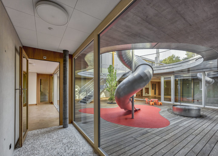 Comment transformer, dans un environnement urbain, des halles industrielles en une crèche ludique et accueillante ? La situation très urbaine des anciennes halles industrielles influence grandement le projet. La structure porteuse des halles existantes est maintenue, mais la cour entre les deux corps du bâtiment est évidée afin d'augmenter la surface du rez inférieur. Cet étage, devenu bien plus généreux, s’articule autour de 3 nouveaux patios qui, par un jeu de vues croisées, ouvrent les pièces et agrandissent l’espace. Ces patios sont utilisés comme airs de détente et leurs aménagements différenciés sont l’occasion de jeux créatifs. Connectés à la nouvelle toiture qui devient la terrasse du rez supérieur, ils offrent aux enfants un parcours de jeux sur deux niveaux reliés entre eux par des escaliers et un toboggan. Les matérialités, volontairement naturelles, ainsi que le choix des couleurs contribuent à l’atmosphère de l’espace.