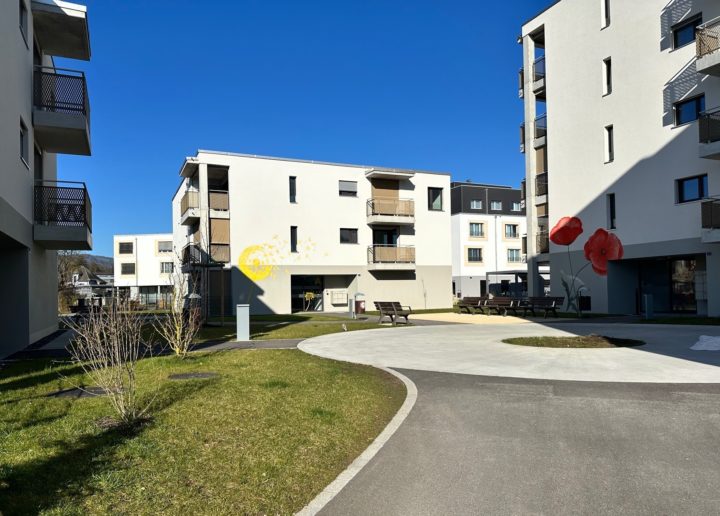 Construction de quatre immeubles dans un éco-quartier en pleine création, comprenant 39 appartements protégés, des locaux communs et une crèche privée. Ces bâtiments sont situés à proximité de l’EMS Les Boutons d’Or, facilitant ainsi la gestion et l’intervention du personnel soignant auprès des locataires. Le quartier adopte une approche intergénérationnelle, avec plusieurs autres immeubles prévus dans les années à venir. Les quatre bâtiments sont disposés autour d’une place centrale, qui dessert les entrées et favorise les échanges entre visiteur⸱euses, locataires et passant⸱es. Tous les appartements sont entièrement adaptés aux personnes à mobilité réduite et aux personnes âgées. Ils disposent chacun d’un espace extérieur privé (loggia) et bénéficient d’une conception moderne, fonctionnelle et très lumineuse. Le choix des matériaux a été pensé pour garantir une harmonie avec le mobilier personnel des locataires.