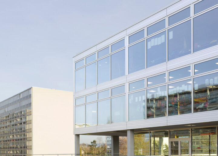 Construite au coeur de la cité-satellite de Meyrin par les architectes Addor, Malnati et Payot, l'école des Boudines fait partie d'un ensemble urbain plus vaste caractéristique des années 1960. Le périmètre fait l'objet d'un plan de site protégeant les constructions ainsi que les espaces verts. Le projet de rénovation et de transformation de l'école des Boudines s'inscrit donc dans une démarche patrimoniale. Les objectifs principaux sont le maintien de la volumétrie générale ainsi que de la modénature des façades rideaux existantes tout en visant une mise en conformité au regard des normes énergétiques, sismiques et de protection incendie. L'adjonction d'un bâtiment parascolaire s'inscrit dans les aménagements extérieurs et complète le programme scolaire.