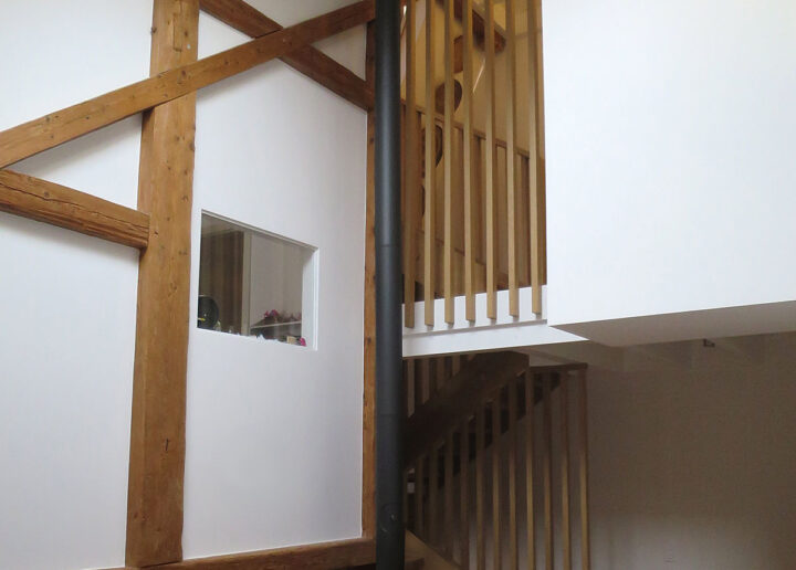 La question de la lumière naturelle dans le futur logement s'est posée de manière particulièrement contraignante, comme pour les anciens ruraux en général. Le projet a recherché à associer la qualité intérieure du logement et le respect de la substance historique. La large ouverture carrée découpée dans le mur sud, au dessus de l'entrée de l'ancienne écurie, a été masquée par une claire-voie en bois en tant qu'évocation du caractère rural de l'édifice. D'autres prises de lumière discrètes (dans le décalage des toitures, au bas du pan de toiture sud ou en lumière zénithale) complètent cette ouverture principale. La composition spatiale est basée entièrement sur un jeu de demi-niveaux. La double hauteur sur l'espace du séjour, baignée de lumière zénithale et avec vue rasante sous l'avant-toit, est surplombée par la boîte de la salle de bains parentale.