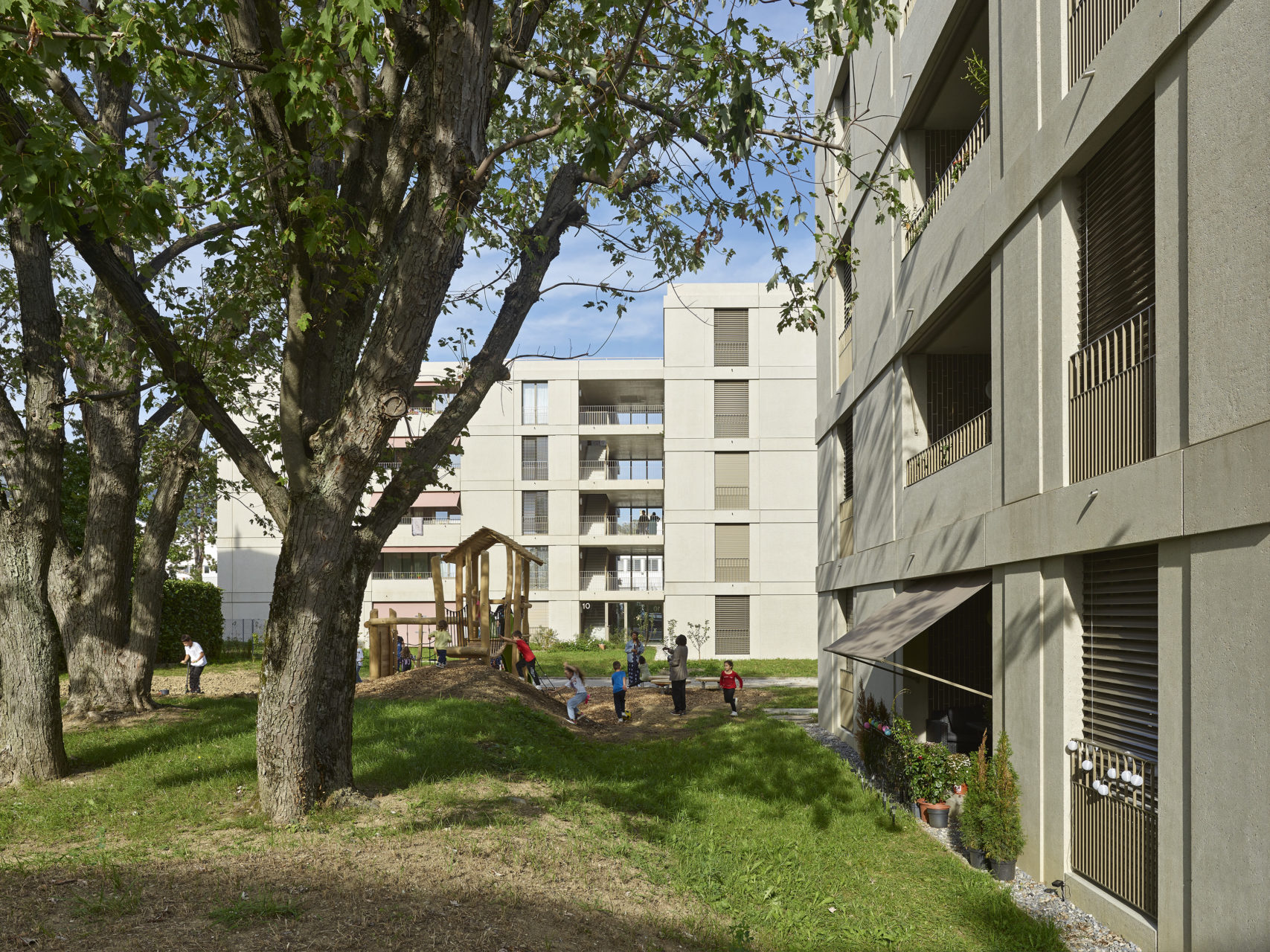 Ensemble de trois bâtiments Minergie P la coopérative d'habitation de Renens: Le projet fait le choix d’une intégration morphologique au quartier en poursuivant le tissu existant. Les nouveaux bâtiments dialoguent avec leurs voisins par leur gabarit, leur volumétrie, leur échelle mais aussi dans les rapports de vide qu’ils créent entre eux. Leur disposition préserve les dégagements de vue pour chacun, bâtiments existants comme nouveaux, et ménage une distance suffisante pour des vis-à-vis de qualité. La matérialisation répond au besoin de durabilité de la coopérative et choisit une expression sobre et retenue. L'ensemble compte 86 appartements desservis par trois cages d’escaliers seulement. Deux plateaux mixtes de trois logements chacun (4p, 3p, 2p) sont regroupés autour de la circulation centrale, accessible côté rue et côté jardin. L’économie de connecter six appartements permet de dilater ce palier commun ouvert sur les espaces extérieurs communs et différenciés.