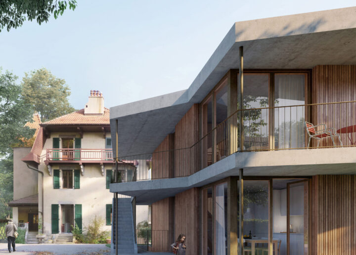 Le projet consiste en deux pavillons de deux niveaux, placés de part et d'autre d'une ancienne maison bourgeoise datant de 1912. Afin que la commune conserve son patrimoine collectif, la substance paysagère et territoriale de la parcelle ont été sauvegardés. Le projet conserve sa forme et son unicité. Il maintient non seulement la maison existante, mais également les arbres et les usages partagés du jardin. Les deux pavillons ont un petit gabarit très inférieur à la maison ancienne et aux arbres qui les entourent. En occupant la totalité de leur niveau, les appartements rappèlent la typologie de la maison ancienne. Chacun jouit de quatre orientations et chaque pièce a une double orientation. Combinée à un principe de décalage, cette configuration permet aux trois bâtiments d'être proches tout en profitant de vues dégagées. Le principe constructif est mixte: il associe dalles de béton et structure verticale en bois. Le revêtement des façades est également en bois.
