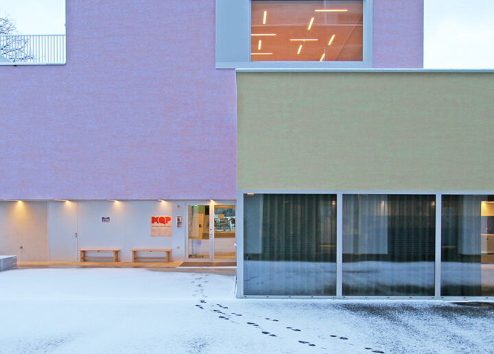 De par sa morphologie le projet dégage des espaces semi-protégés du côté de la ruelle en offrant une place fermée côté route par un mobilier urbain multi-usages. L'espace polyvalent de la MQP est situé au centre de cet espace extérieur et pourrait être associé à un grand couvert. Vitré et donnant sur la place, l'espace polyvalent s'ouvre sur trois côtés et fait le lien avec le quartier.