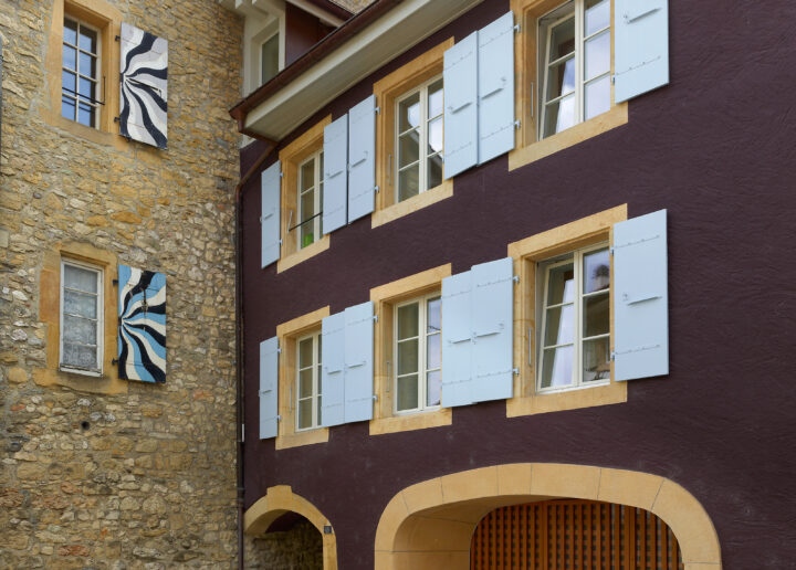 La Grande Rue à Auvernier, qui s'étend du château à la maison de commune, a conservé son caractère typique fait de belles maisons du XVIe au XVIIe siècle bordant une rue pavée. La parcelle très allongée bordée sur toute sa longueur par un étroit passage publique offre sa façade principale sur la Grand Rue. La caractéristique de la rénovation a été de conserver l’extérieur avec ses ouvertures limitées et revoir la spatialité intérieure avec le défi d’amener lumière au centre. L’élément de composition principal est la verticalité qui se manifeste par les escaliers de circulation alignés et disposés en enfilade, par les puits de lumière et par les doubles volumes comme la grande bibliothèque. La circulation évite les espaces intimes et dirige directement vers les pièces de jour. Dans le jeu d’imbrication des espaces, la cuisine et le séjour sont au deuxième étage sur deux demi niveaux prolongés par une terrasse. Les portes et volets en claustrât brouillent les limites avec l’extérieur.