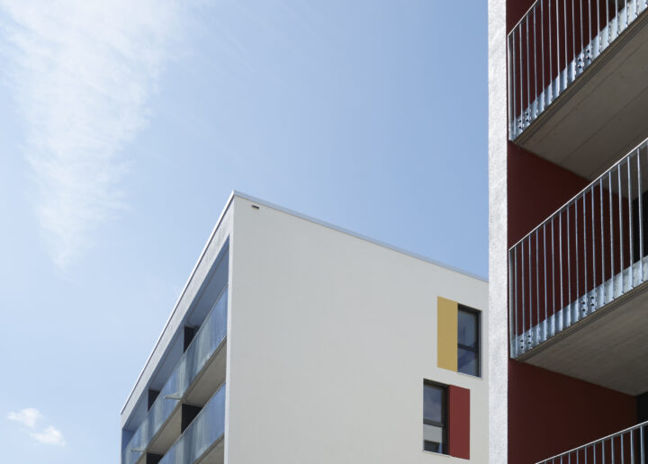 Direkt am Bahnhof liegen drei dicht zueinander stehende, 5-geschossige Häuser auf einer gemeinsamen Tiefgarage, spannen zwischen sich und dem Bahnhof einen platzartigen Raum auf und schliessen gleichzeitig den angrenzenden Lindenpark gegen Südwesten ab. Die Häuser sind zum Platz hin erschlossen. Je ein mittleres Treppenhaus erschliesst sechs kleinere Wohnungen (3½ Zi. und 2½ Zi.) pro Geschoss. Alle Wohnräume befinden sich an den komplett verglasten Stirnseiten und sind mit einer grosszügigen vorgelagerten Verandaschicht versehen. Zu den Längsseiten sind die Schlafzimmer angeordnet, welche mit französischen Fenstern belichtet werden. Diese sind zur gegenüber liegenden Fassade versetzt angeordnet - keine direkte Einsicht - und erscheinen dank den changierenden farbigen "Intarsien" grösser als sie sind. Die Aussenwände sind als "Curtainwall" ausgebildet; vorfabrizierte Holzelemente mit verputzter Kompaktfassade.