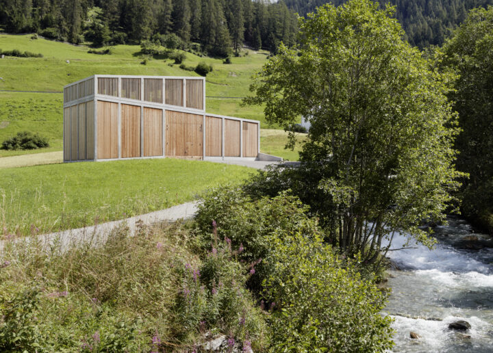 Neubau Wasserkraftwerk Ragn d’Err Die Zentrale Mulegn ist etwa in der Mitte der Flachstrecke des Ragn d’Err zwischen Kantonsstrasse und der Mündung in die Gelgia, nördlich des Bachlaufs platziert. Die Zufahrt erfolgt über die parallel zum Ragn d'Err verlaufende Gemeindestrasse. Das Gebäude ist so ausgerichtet, dass dieses bei einem allfälligen Hochwasseranfall möglichst schadlos bleibt. Die Grundrissform ist ein längliches Rechteck mit einer Breite von 11.30 m und einer Länge von 23.50 m. Zwei in der Höhe gestaffelte Pultdächer mit Gefälle in Längsrichtung und einer Traufhöhe von ca. 5.0 m bzw. 11.0 m bilden die Dachform. Der Sockel und die Dachneigung stehen im formalen Bezug zum Terrainverlauf. Die Tragstruktur ist eine innen und teilweise auch aussen sichtbar bleibende Betonkonstruktion. Das Gebäude wird aussen gedämmt und mittels einer Holzbohlenkonstruktion verkleidet. Belichtet wird das Haus über einen Oberlichtkranz.