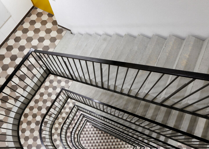 Reconstruire pour densifier. Situé au bas de l’avenue d’Ouchy, à deux pas du lac, le bâtiment prend la place d’un immeuble de 50 appartements construit par la SCHL en 1933, et qui ne répondait plus aux attentes actuelles en termes de surface et de confort. L’immeuble abrite 67 appartements de 2 à 4 pièces, distribués par trois cages sur 7 niveaux. L’épaisseur du bâtiment ayant été optimisée, et bien que la surface des logements soit plus généreuse, un plus grand nombre d’appartements à loyer abordable a pu être créé. La toiture terrasse est aménagée en espace de rencontre et de loisirs pour les habitants de l’immeuble, financé grâce au pourcent culturel de la SCHL baptisé Plus SCHL. Le projet, dans sa volumétrie et à travers l’expression de sa façade principale, reprend des caractéristiques de l’immeuble démoli et de plusieurs bâtiments historiques voisins -l’expression du socle, les matériaux et couleurs, les ouvertures et les balcons- tout en les réinterprétant de façon contemporaine