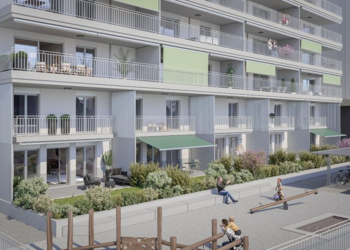 Le projet s’inscrit dans le tissu urbain de la rue des Parcs. Une passerelle piétonne fait écho aux typologies d'origine, enjambant une ruelle privée en contrebas. De là, on accède aux cinq maisonnettes urbaines, chacune dotée de son propre jardin. La composition du bâtiment se distingue par trois parties programmatiques clairement identifiées, dont la lecture est renforcée en façade par une modénature du crépi et des éléments structurants. Le socle et sa marquise végétalisée, accueillant l'entrée et les 5 duplex, le corps principal avec ses 16 appartements de 2 pièces 1/2 à 4 pièces 1/2 et l’étage en attique proposant 3 unités plus luxueuses de 3 pièces 1/2. Chaque appartement bénéficie d’un balcon généreux et d’un accès à une place de jeu et de détente commune. Les unités sont également pourvues d’une place de parc dans l'immeuble, grâce à la mutualisation de la rampe d'accès avec l'immeuble voisin.