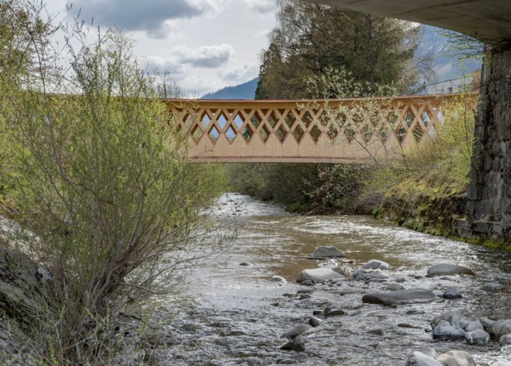 En franchissant la rivière, la passerelle des Buissons propose une nouvelle liaison entre les habitations au sud des berges et le centre ville de Bulle, au nord. Elle complète ainsi le réseau de mobilité douce tout en valorisant les rives de la Trême. Parallélépipède ajouré aux arêtes arquées, sa structure est une réinterprétation contemporaine de la poutre à treillis. Ses diagonales sont constituées de l’entrecroisement de trois à quatre lattes (27/200mm) qui travaillent en traction et en compression. Ce treillis est pincé entre deux membrures dont la courbure en partie basse augmente le tirant d’air face au risque de crues. La protection de l'ouvrage contre les intempéries est assurée par un toit légèrement incliné, complété d'un avant-toit d'une longueur de 1.2 m, couvert d'une ferblanterie en cuivre. La passerelle a été assemblée sur la parcelle voisine et mise en place en une nuit avec une grue de 500 t. L'ouvrage est labellisé Bois Suisse.