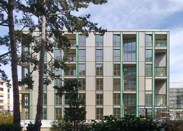 Le volume forme l’angle nord-ouest de l’îlot, profitant de multiples orientations. Au rez-de-chaussée, le bâtiment offre une traversée reliant le chemin des Bossons et la cour de la pièce urbaine. Ce passage couvert constitue un seuil entre l’espace public et l’intériorité des logements. À la fois lien et lieu, espace de rencontres, abritant vélos et boîtes aux lettres, il donne accès au hall d’entrée de l’immeuble. La cage d’escaliers dessert six logements par étage. Dans les appartements d’angle, une zone de l’espace de vie jouit d’une double-hauteur qui se prolonge sur la loggia. La générosité des espaces à double-hauteur et les ouvertures qu’ils offrent sur l’extérieur confèrent un caractère singulier aux logements. La structure du bâtiment est composée de poteaux et de dalles en béton armé, alors que l’enveloppe est constituée d’une ossature en bois revêtue de bardage. La façade exprime le jeu des volumes intérieurs par son dessin régulier interrompu au droit des doubles-hauteurs.