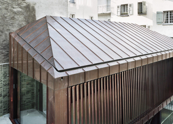 Nous avons hérité d’une cour à l’abandon, oubliée au fond d’un corridor, un non-lieu.Il nous fallait inventer un programme pour lui redonner vie et la révéler. L’architecture sert, aussi, nous le croyons, à cela. Un thème riche, l’installation d’une maison de ville. Verticalement, profondément, la cour s’est agrandie et, au-delà de la forme, imposée, nous avons fait le choix d’une unique matérialité. Observée de toute part, sa toiture devenait sa façade principale, recouverte de cuivre, elle s’est en quelque sorte propagée pour habiller par déclinaison, l’ensemble, dans une abstraction géométrique. Le but poursuivi était de démontrer que, dans une situation historique presque figée, il demeurait possible de proposer une définition contemporaine de l’espace et de sa représentation. Ainsi, en renouant le lien qui existait autrefois avec la rue, nous nous inscrivons dans une continuité, celle de la ville qui se bâtit sur elle-même, encore et sans cesse. La cour, c’est la maison?