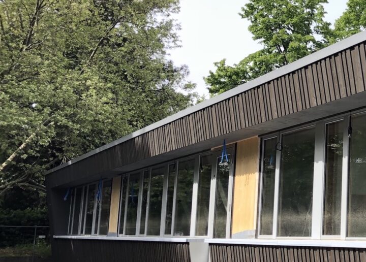 Le pavillon scolaire construit dans les années 60 ne répondait plus aux normes thermiques actuelles et avait besoin d’un assainissement global. L’école de Florissant à proximité ne disposant pas d’un accueil collectif de jour, la commune de Renens a décidé de conserver le pavillon et de l’aménager en APEMS afin d’offrir une infrastructure pouvant accueillir jusqu’à 48 enfants. La structure bois de la charpente et des façades a été maintenue. Ce choix a orienté le projet dans l’utilisation de matériaux et d’énergies renouvelables. La nouvelle toiture à deux pans a unifié la volumétrie et offert un espace d’accès abrité. La grande baie vitrée a été conservée afin de favoriser la relation entre l’intérieur et le Parc. Les ouvertures en façade et en toiture garantissent un apport de lumière naturelle utile à l’activité de l’APEMS. La façade habillée d’un bardage en bois, sobre et foncé met en valeur la nature environnante du Parc Carl Sauter.