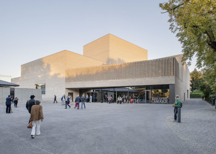 Le Théâtre conforte un lieu de création complet dans le dense tissu carougeois. La friction entre un site très restreint et de grandes contraintes théâtrales impose une forte concentration où tous les éléments se fédèrent en un seul organisme. A l’échelle du site, le projet compose cinq grandes pièces du programme (trois nouvelles salles, salle des fêtes existante, esplanade d’entrée) en exploitant leurs interstices pour définir les circulations intérieures et extérieures. Côté public, le foyer s’ouvre complètement sur l’esplanade tandis qu’à l’arrière la halle de montage forme une cour intérieure regroupant les scènes et les ateliers de décors. L’enveloppe du Théâtre présente un jeu de masses étagées pour maîtriser leur échelle. L’absence de joints de dilatation dans les parements renforce le caractère monolithique du bâtiment. La couleur beige, la dimension de la brique président au dialogue des façades avec le ciel, la ville et la végétation.