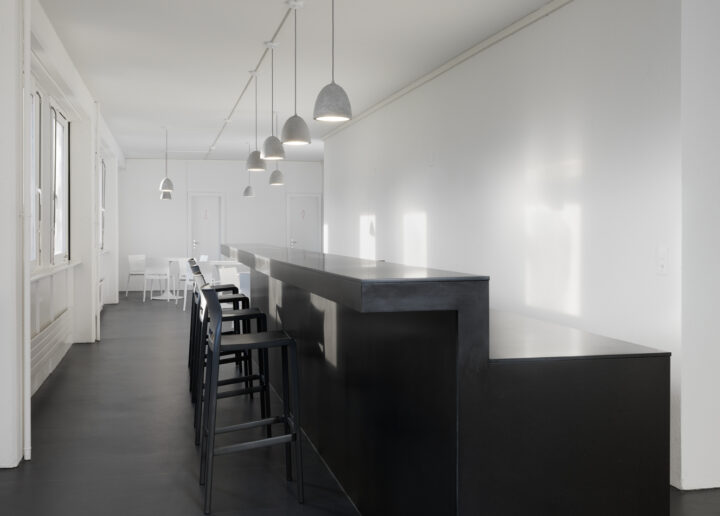 L’âme de cette transformation repose sur l’expression de sacralité dans un ancien bâtiment commercial. La structure d’origine est caractérisée par sa composition de piliers, sommiers et dalles en béton. La flexibilité de ce système autorise l’ouverture des pièces en un espace généreux et baigné de lumière naturelle. Seul le glissement d’un rideau permet de séparer, ou de lier, le lieu d’accueil et le lieu de culte. L’économie de moyens a encouragé l’utilisation de matériaux bruts. Dans le même esprit, le pattern de textures murales est unifié par une simple teinte blanche. Elle abstractise l’espace tout en mettant en valeur le découpage de la structure massive et la sensation d’ancrage des sols foncés. Le rideau contrebalance cette atmosphère par son aspect léger et soyeux. Le désir de cette église a été que l’architecture accompagne l’esprit d’accueil de la communauté. Le bar, par sa configuration, s’immisce de manière subtile dans l’espace cultuel afin d’encourager la rencontre.
