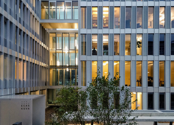 Transformation et agrandissement du siège de l'établissement cantonal des assurances sociales, projet lauréat d'un concours SIA 142. Le projet s'articule en deux volets, une extension et l'assainissement du bâtiment existant, l'idée étant de réunir sur un seul site les différentes entités de l'ECAS pour offrir une identité forte mais pas ostentatoire. Le nouveau volume s'implante au Sud du bâtiment existant, définissant ainsi un espace d'entrée à l'échelle du site. Les deux bâtiments sont connectés par des passerelles qui font le lien entre les deux entités. Le parking extérieur existant a été déplacé dans le sous-sol de l'extension, permettant ainsi l'aménagement d'espaces verts pour les usagers et pour le quartier. Le projet est fonctionnel avec un langage simple et sobre, en adéquation avec son utilisation. Afin d'offrir différentes vues vers l'extérieur et de laisser pénétrer la lumière naturelle jusqu'au coeur de chaque étage, toutes les circulations s'ouvrent en façade.
