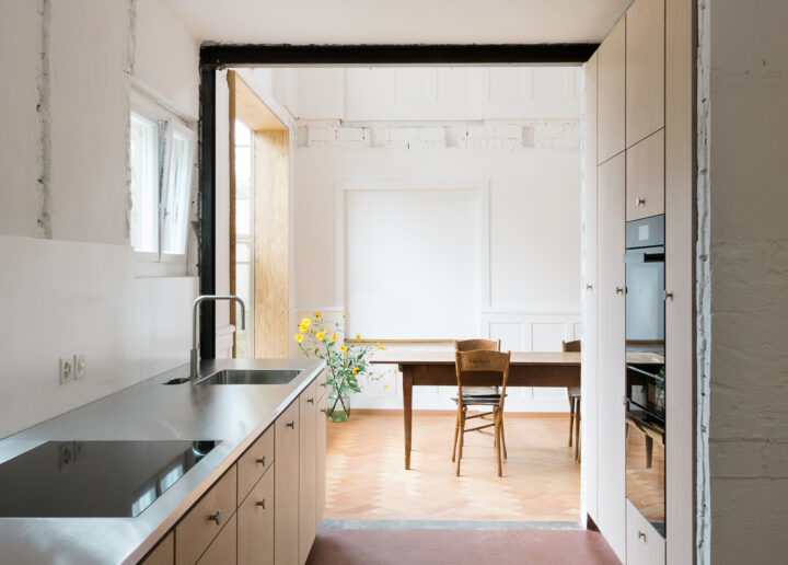 Ein Haus aus den 1930er-Jahren mit zwei kleinen Geschosswohnungen und Mansarde wird zum Einfamilienhaus für eine junge Familie. Die Subtraktion von Bauteilen und lediglich punktuelles Einfügen von neuen, raumdefinierenden Einbauten aus Holzplatten sind die Mittel der grundlegenden räumlichen Umgestaltung. Der auf zwei Arten radikale Umgang mit dem Bestand, einerseits in der Direktheit des Abbruchs und andererseits im kompromisslosen Erhalt, würdigt dass Haus in seiner ursprünglichen Kraft und haucht ihm zugleich ein zweites Leben ein. Durch den bewussten Verzicht auf vereinheitlichende Massnahmen bleiben die ursprünglichen Elemente des Hauses atmosphärisch prägend. Teils können sie ihre ursprüngliche Aufgabe noch lange weiter erfüllen, teils bleiben sie als Spuren lesbar; alle jedoch stehen im gleichberechtigten Verhältnis zum bewusst detailreich belassenen Raum.