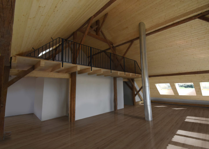 Dans le haut du logement d'une ancienne ferme datant des années 1830, la propriétaire fait aménager un espace polyvalent, lieu de rencontre et d'activités familiales. C'est l'occasion de développer un travail de relecture de ce grand espace, avec insertion de quelques fonctions (circulations, sanitaires, mezzanine) et mise en valeur de la structure ancienne. Les prises de lumière utilisées sont principalement des ouvertures préexistantes, complétées avec parcimonie.