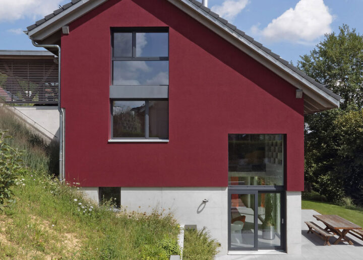Villa construite sur un terrain à forte pente tourné vers la vallée de la Broye. La maison, qui est accrochée à la route au niveau des combles par un couvert à voitures en lames ajourées, possède des entrées différenciées à tous les étages : une entrée supérieure liée à l'espace de bureau et à la suite parentale, l'entrée principale au niveau intermédiaire donnant sur la mezzanine-bibliothèque et l'espace à double hauteur, et un accès direct et de plain pied au jardin depuis l'espace cuisine - séjour. Construction en béton et ossature bois, dalles intérieures en bois massif. Façades supérieures crépies de couleur rouge.
