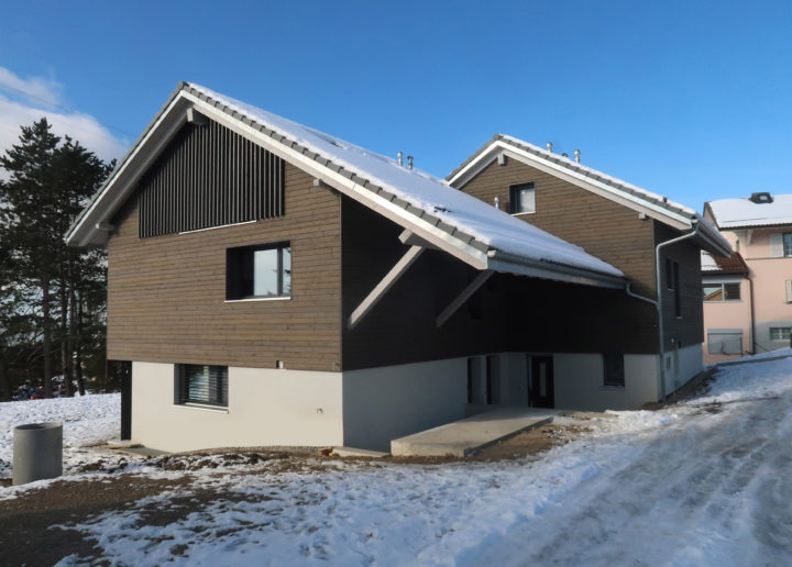 La parcelle qui a accueilli ces nouvelles maisons fut autrefois traversée par la ligne de tramway et elle est donc restée une des dernières du quartier libre de constructions. Pour l'édification de ces deux villas mitoyennes, la construction en bois d'origine suisse a été privilégiée : dalles massives en bois, parois en ossature bois, façades en lambris ajouré, escaliers et différentes claires-voies. Les villas sont complétées par des petites constructions annexes : couverts à voiture, réduits à vélos, toujours dans une construction et avec des matériaux similaires aux maisons principales. Implantation décalée des maisons pour offrir un maximum d'intimé pour les différentes unités alors que le terrain et son grand jardin reste uni et sans entrave pour une utilisation communautaire à la manière d'un petit éco-quartier. Production solaire d'électricité et récupération d'eau de pluie vont de soi pour ce type de réalisation contemporaine.