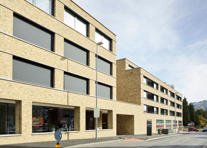 Das Wohn- und Geschäftshaus schliesst den Bahnhofplatz Richtung Osten ab und bildet zugleich den Auftakt zur Bahnhofstrasse. Dieser städtebaulich markanten Lage wird durch die volumetrische und funktionale Gliederung Rechnung getragen, basierend auf dem baurechtlich zugelassenen Spielraum: Einschnitte entlang der Bahnhofstrasse und der Bahnlinie erzeugen über dem durchgehenden Sockelgeschoss ein mäanderförmiges Volumen. Während die Büronutzung zum Platz orientiert ist, befinden sich die Wohnungen entlang der Strasse mit Blick zum östlich gelegenen Parkgrundstück. Die durchgängige Dachkote sowie die Materialisierung in hochwertigem Sichtmauerwerk verbindet die differenzierte Gebäudeform zu einem Ganzen und verleiht dem Neubau die gewünschte einheitliche Erscheinung.