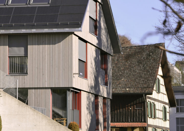 Im Osten von Weinfelden wird ein historischer Dorfkern durch diesen Neubau ergänzt und vervollständigt. Das Minergie P - Gebäude ist als Wohnhaus mit Einliegerwohnung konzipiert. Im Untergeschoss befinden Service-Bereiche, im Erdgeschoss liegt eine Einliegerwohnung mit 4 Zimmern. Das Obergeschoss beinhaltet zusammen mit dem Dachgeschoss eine 5 Zimmer-Wohnung, wobei sich der Koch- Ess- und Wohnbereich im Dachgeschoss befindet. Das Untergeschoss ist auf dem stark geneigten Hang-Grundstück inklusive Decke über UG betoniert, die oberen Geschosse und das Dach sind in Holzbauweise erstellt. Die Fassaden springen geschossweise nach aussen und sind mit einer vertkalen Holz-Lattung verkleidet. So entsteht eine horizontale Gebäudegliederung, die die Geschossigkeit des benachbarten Altbaus aufnimmt. Dieser wurde in diesem Zusammenhang im Minergie - Standard saniert und umgebaut.